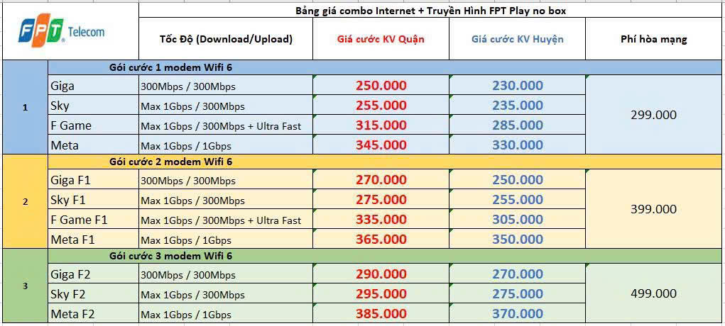 II.Bảng Giá Gói Cước Combo Internet + Truyền Hình FPT